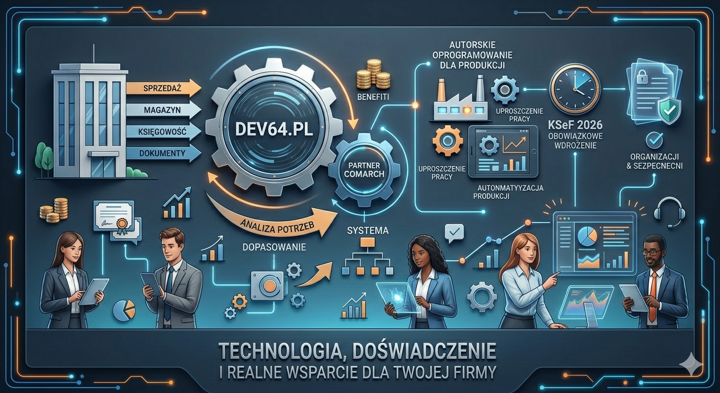 dev64.pl to partner Comarch z ponad 20-letnim doświadczeniem. Wspieramy firmy we wdrażaniu oprogramowania do zarządzania, dostosowujemy je do potrzeb, szkolimy zespoły i rozwijamy własne autorskie rozwiązania dla firm produkcyjnych. Pomagamy kompleksowo — od systemu po sprzęt.